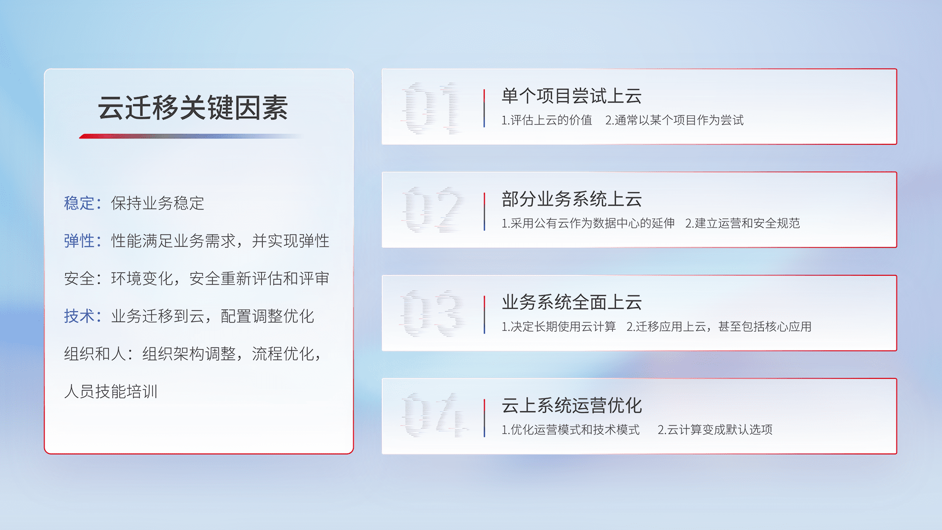 结合实际业务,,,从规划设计、、云平台选型、、、云原生改造、、、、数据迁移、、集成交付,,,迁移全过程为客户识别最佳上云路径,,,做好风险识别管理,,,设计网络架构、、、身份权限、、安全审计合规、、、、操作审计、、、、日志审计、、、监控告警策略、、、、多站点容灾设计等,,对云上基础设施进行整体规划,,,,提升IT治理水平,,,以满足弹性、、、高可用、、、高性能的需求。。