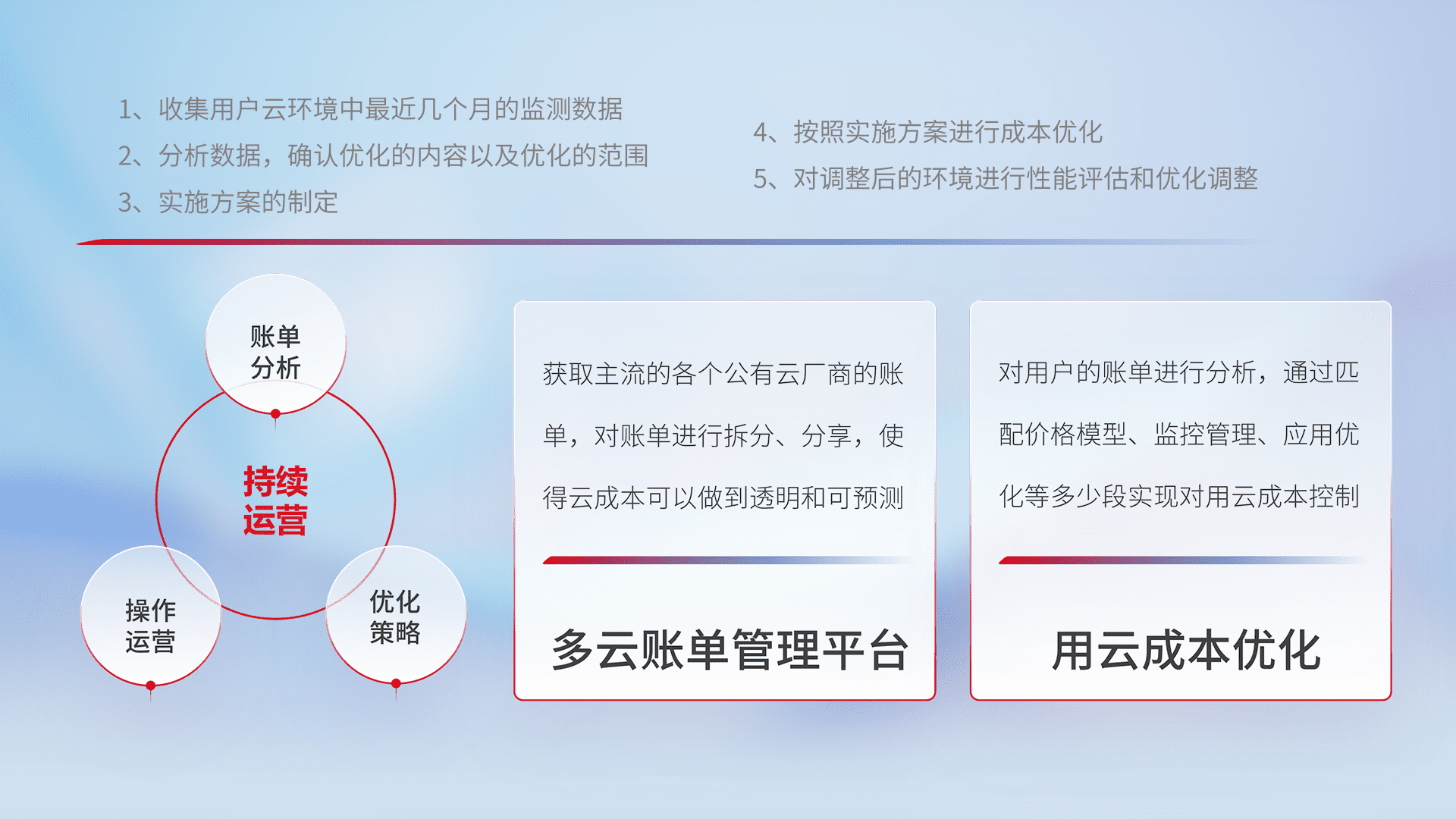 通过多云纳管,,,,以统一的资源数据模型把客户的云资源进行抽象和封装,,进而实现对多云资源的统一操作,,保障云资源管理的可靠性、、、稳定性与可用性。。量身定制化运维内容,,,配置、、、、开发运维、、、补丁管理、、、备份、、、、监控、、、认证和访问管理、、、审计和日常巡检等,,保障在用云过程中的可靠度,,稳定度以及高可用率。。