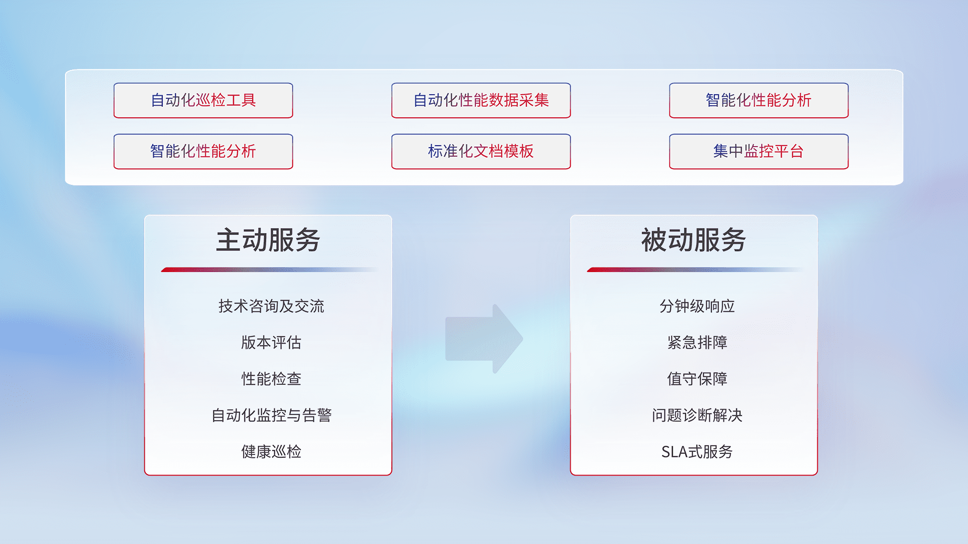 智能化工具和标准化文档,,,,保障服务质量,,,提供主动服务(包含技术咨询、、、版本评估、、、性能检查、、、、自动化监控与告警、、、健康巡检)和被动服务包含(分钟级响应、、、紧急排障、、值守保障、、、、问题诊断解决、、、SLA服务)。。。